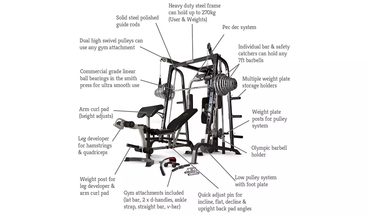 The thoroughbred all-in-one gym. Combining a smith machine, power rack and cable gym together with a commercial grade adjustable bench for the ultimate comprehensive workout machine. Train any muscle with an almost endless range of exercises. If you want a home gym without compromising your exercise options then look no further. PLEASE NOTE THIS ITEM IS DELIVERY TO KERBSIDE ONLY.